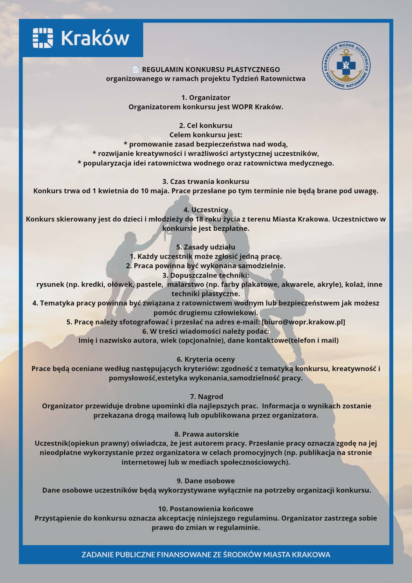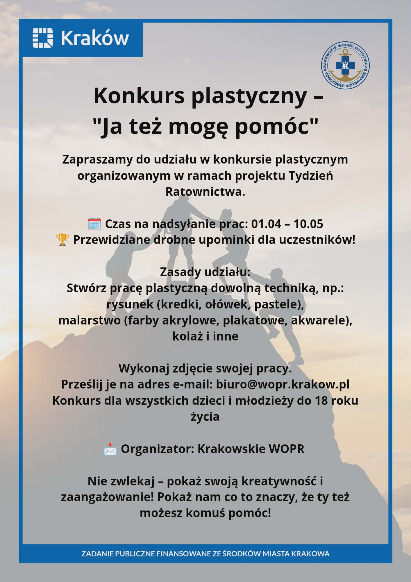 1. Konkurs plastyczny 01.04-10.05 “Ja też mogę pomóc”, technika dowolna, zdjęcie pracy należy przesłać na mail biuro@wopr.krakow.pl